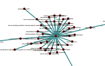 • Clustering: In this particular instance, I can find the "clusters" of my blog. You can see 3 big aggregations of keywords and landing pages (left-middle,up-center and right-middle). Each one of these marks pages and groups of pages with several landing keywords. The groupings mark like the "big themes" in my blog, at least from search engine traffic (these are memory techniques, 9 best programming books I've read and seed germination respectively). Oddly enough, I've had one visit landing in seed germination from the keyword "gnus mail", thus the big seed germination cluster includes emacs.