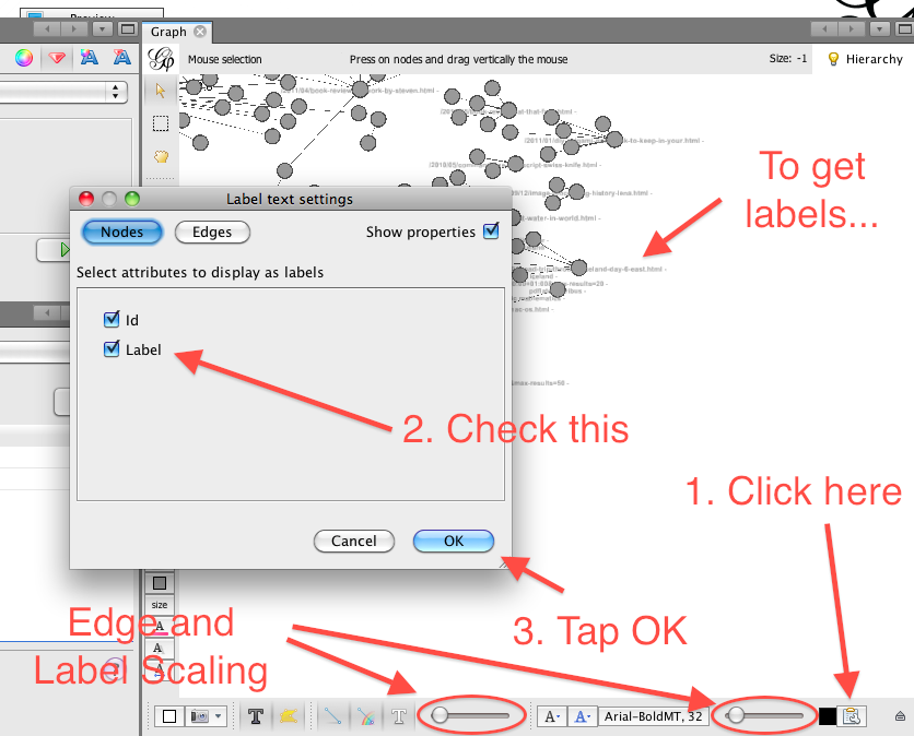 The result from the Force Atlas algorithm to distribute points will look nicer, spreading aggregates of arrows all over the place. Now we need to get the labels. To do so, you have to click on a somewhat hidden button in the bottom-right part of the Graph window, and select the correct names for the tags. In this picture I've also marked the label and edge scaling according to parameters:
